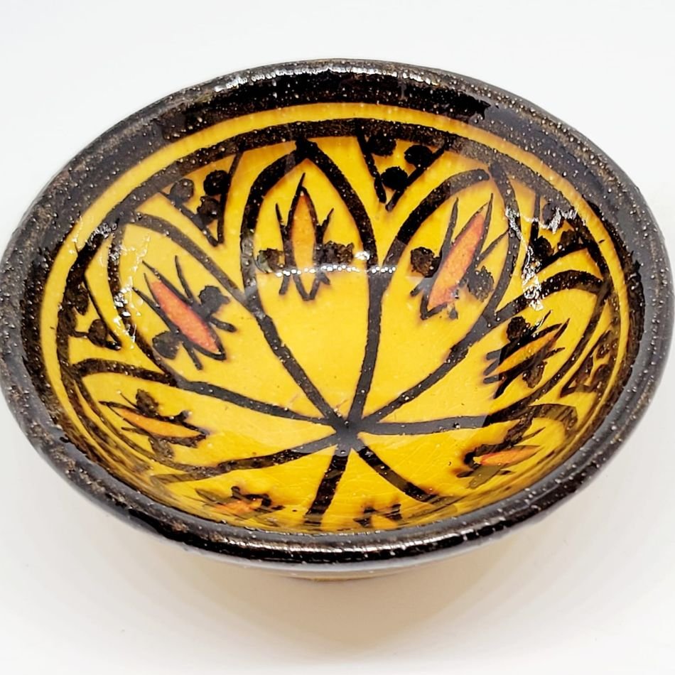 Hand-painted Moroccan ceramic bowl featuring a captivating vivid yellow and black design, this approximately 7cm serving bowl (3cm deep) is ideal for presenting your Roots Treasures Amlou, Moroccan Argan Oil, or golden honey.